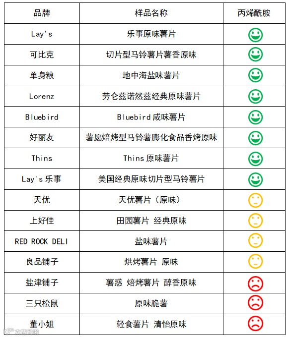 经检测,安全指标方面,15款薯片样品理化指标、微生物指标、重金属污染物、抗氧化剂均符合国标要求,且反式脂肪酸含量低。
