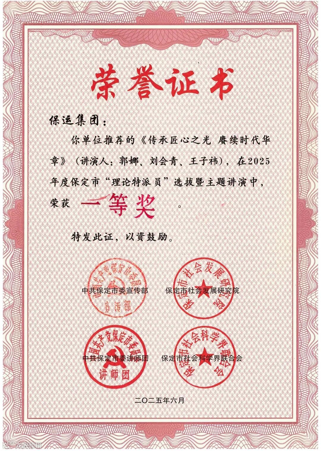 决赛现场,选手们运用组合式、情景式、互动式、穿越、科技智能嵌入式理论宣讲新模式,运用微电影、舞台剧等丰富多彩的形式,让现场观众尽情享受视听盛宴。保运集团郭娜陆地航空班宣讲团以《传承匠心之光 赓续时代华章》为题,讲述了“陆地航空”服务品牌的接力传承故事,以96.78分,全场第二名的成绩荣获大赛一等奖。
