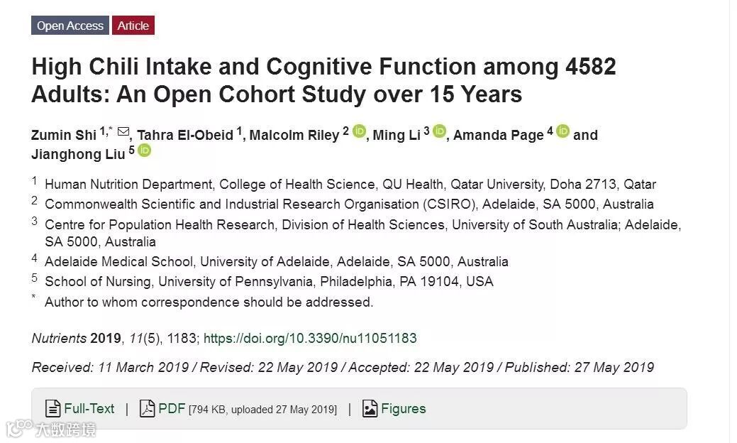 “这个研究结论被误读了。”该研究第一作者、卡塔尔大学健康学院人类营养系副教授史祖民强调,该研究是前瞻性队列研究,利用的是一种观察性的研究方法,得出的结果是相关性,而不是因果关系。也就是说,该研究提示辣椒与认知功能下降有一定相关性,可为进一步研究做铺垫。关于干扰因素没有排除的争议,史祖民介绍说,已尽可能对年龄、性别等因素进行排除和校正,但一些混杂因素确实可能影响结果,比如教育水平,有待后续研究。