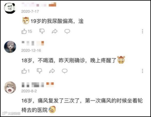 类似像郭麒麟一样,十几、二十多岁发生痛风的,也不在少数。《痛风748例临床特征分析》提到,2008-2013年,青年患者所占比例逐年上升,分别为 39% 、39. 4% 、40% 、42% 、48% 、52% ,甚至超过了中老年患者。②
