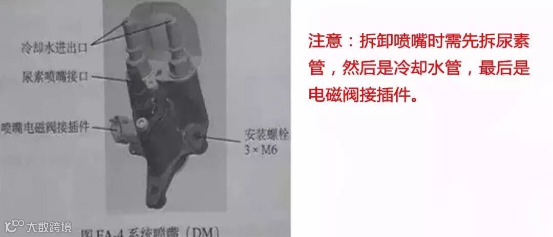 这样做的目的是为了使尿素结晶快速溶解,如果条件允许也可以在不拆下尿素管路和尿素喷嘴冷却管路的情况下在车上进行清洗,清洗方法一样。
