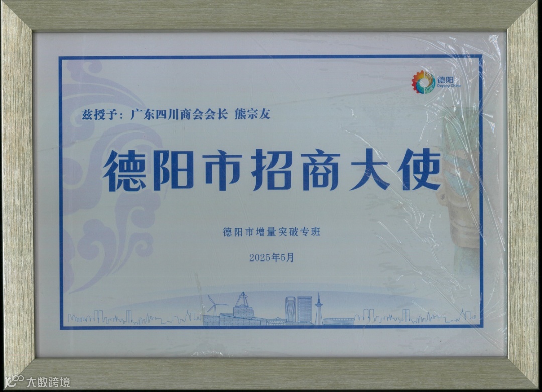 广东四川商会会长熊宗友受邀出席大会,并获聘“德阳市招商大使”。同时受聘的还有湖北省四川商会、新西兰川渝总商会等兄弟商协会负责人。此次受聘不仅是对广东四川商会长期推动川粤互动、助力四川发展的高度肯定,也标志着商会将在政企合作、产业协同、项目对接中继续发挥更大作用。