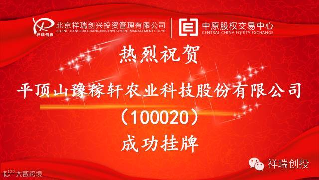 热烈祝贺祥瑞创投推荐的【豫稼轩】在中股交成功挂牌
