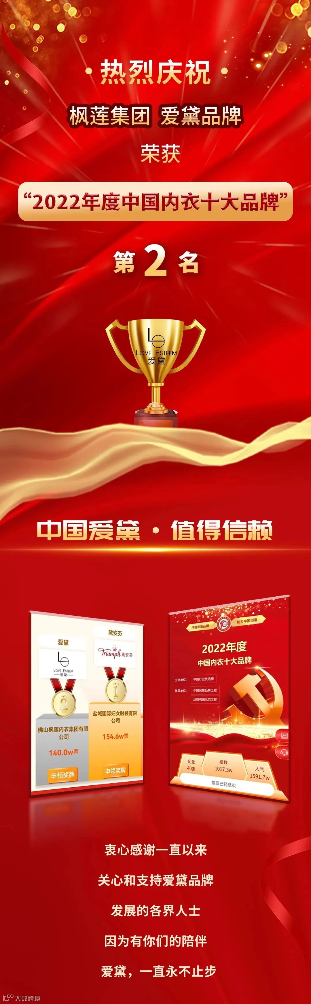 热烈祝贺我会佛山分会会长单位广东枫莲集团爱黛品牌荣获“2022年度中国内衣十大品牌”。