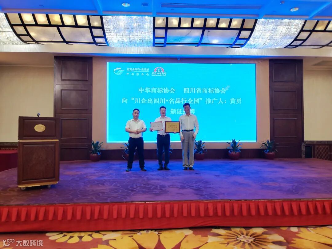 中华商标协会会长马夫、四川省商标协会秘书长陈洪银向广东四川商会执行会长黄勇颁发“川企出四川·名品行全国”推广人证书并授牌。