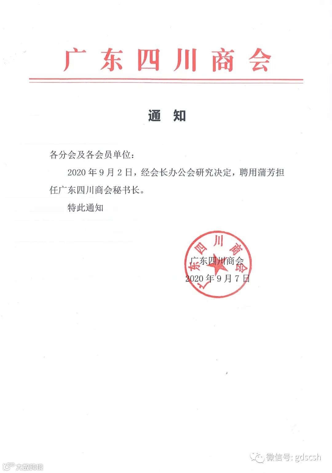 2020年9月2日,经会长办公会研究决定,聘用蒲芳担任广东四川商会秘书长。