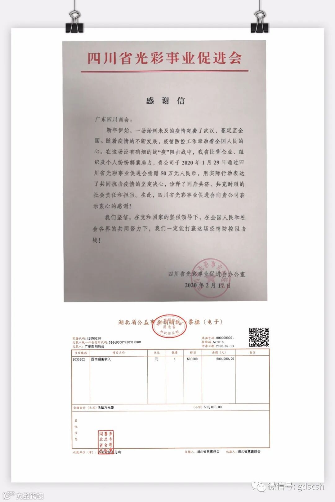 1、1月29日,广东四川商会向四川省光彩事业促进会捐赠现金50万元转交湖北省慈善总会,用于帮助抗疫防控工作