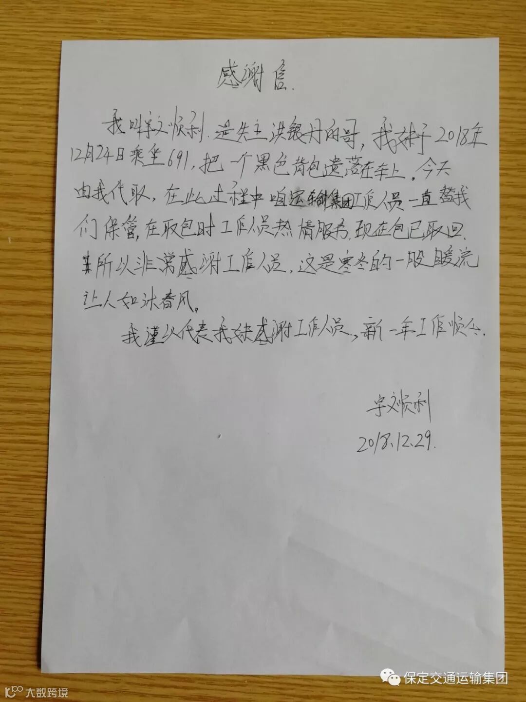12月29日下午,石家庄市行唐县一位叫宇文顺利的先生,在九公司行车二队办公室,当场诚恳地写下了一封感谢信,字里行间,无不充满着对我们行车二队工作人员的感激。信的内容是这样的:“我叫宇文顺利,是失主洪银丹的表哥,我妹于2018年12月24日乘坐691,把一个黑色的背包遗落在车上,今天由我代取,在此过程中咱运输集团工作人员一直替我们保管,在取包时,工作人员热情服务,现在包已取回,所以非常感谢工作人员,这是寒冬的一股暖流让人如沐春风,我谨代表我妹感谢工作人员,新一年工作顺利!”