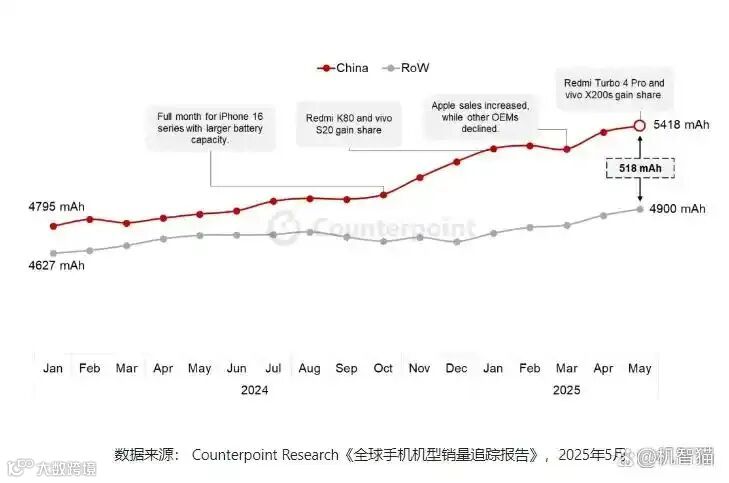 报告显示,全球超过70%的智能手机都已经搭载了5000mAh以上的电池,而中国市场的内卷程度全球领先,手机平均电池容量在2025年5月就达到了5418mAh,比海外市场高出逾500mAh。