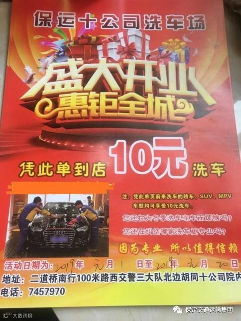 2019年1月1日保运集团十公司洗车场隆重开业,公司倾情打造洗车场“欢度元旦、盛大开业”大型促销活动,2019年1月1日至1月20日,前来洗车的朋友均可凭宣传彩页优惠洗车,敬请尊享。
