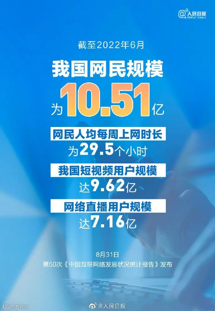 8月31日,中国互联网络信息中心(CNNIC)在京发布第50次《中国互联网络发展状况统计报告》,《报告》显示,截至2022年6月,我国网民规模为10.51亿,互联网普及率达74.4%。