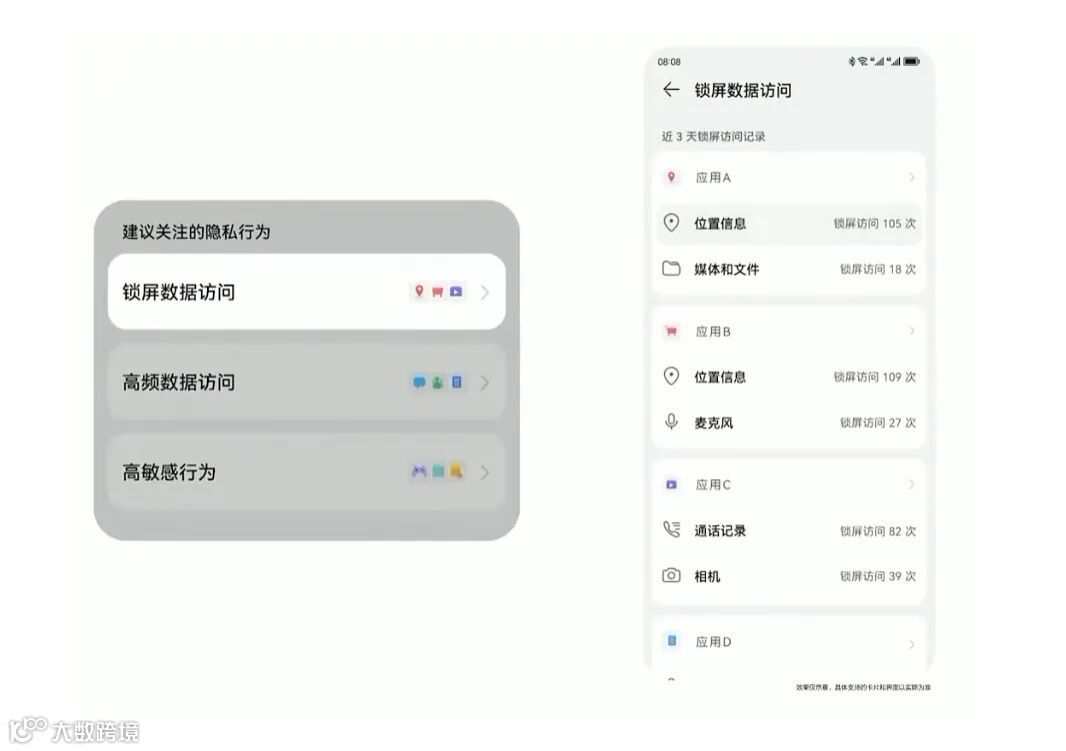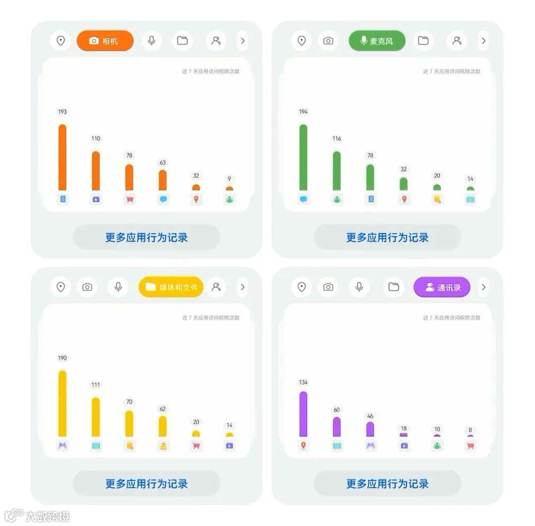 1、隐私中心数据可视化,相机、麦克风、位置信息、通讯录等敏感信息的所有访问次数都直观表现出来,可以查询是谁索取数据最多。