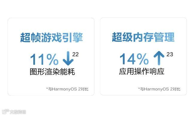 更多老机型都可以升级HarmonyOS 3,相较于之前的版本超帧游戏引擎图形渲染能耗下降11%、超级内存管理应用操作响应提升14%。