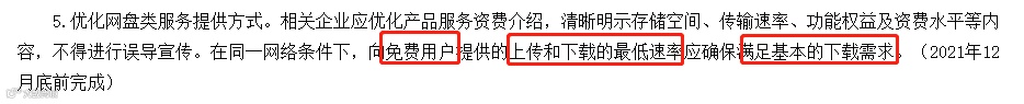 在本月1号,工信部发布了《关于开展信息通信服务感知提升行动的通知》。其中有一条通知明确,在同一网络条件下,网盘企业向免费用户提供的上传和下载的最低速率应确保满足基本的下载需求。