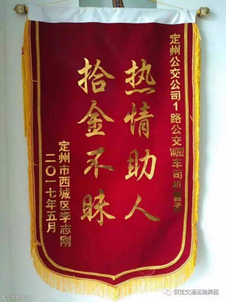 5月8日,定州西城区李志刚到公交车队送来一面锦旗,上面写:“拾金不昧,热情助人。”