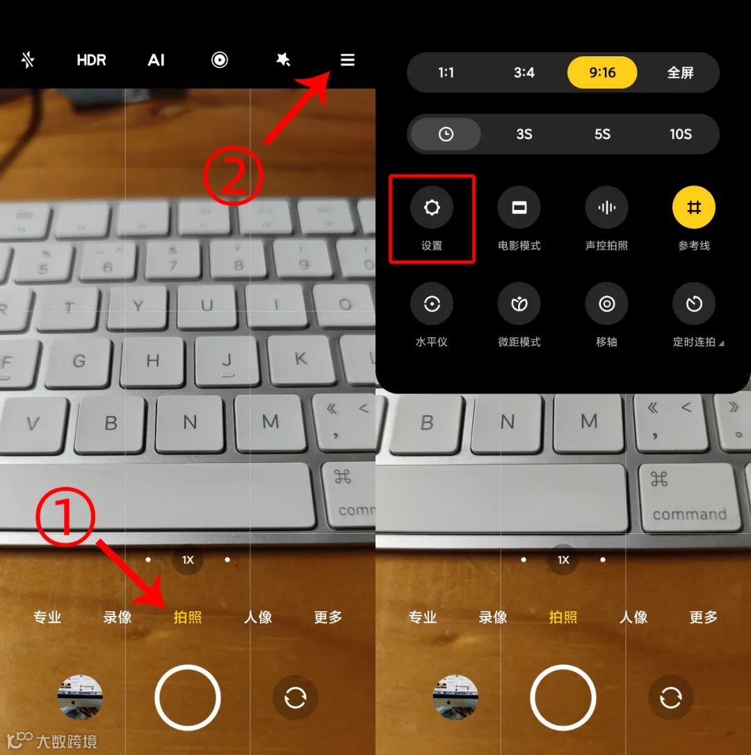 然后再重复第一步,打开相机,在拍照模式下点击右上角的三条横杠再点击选择设置