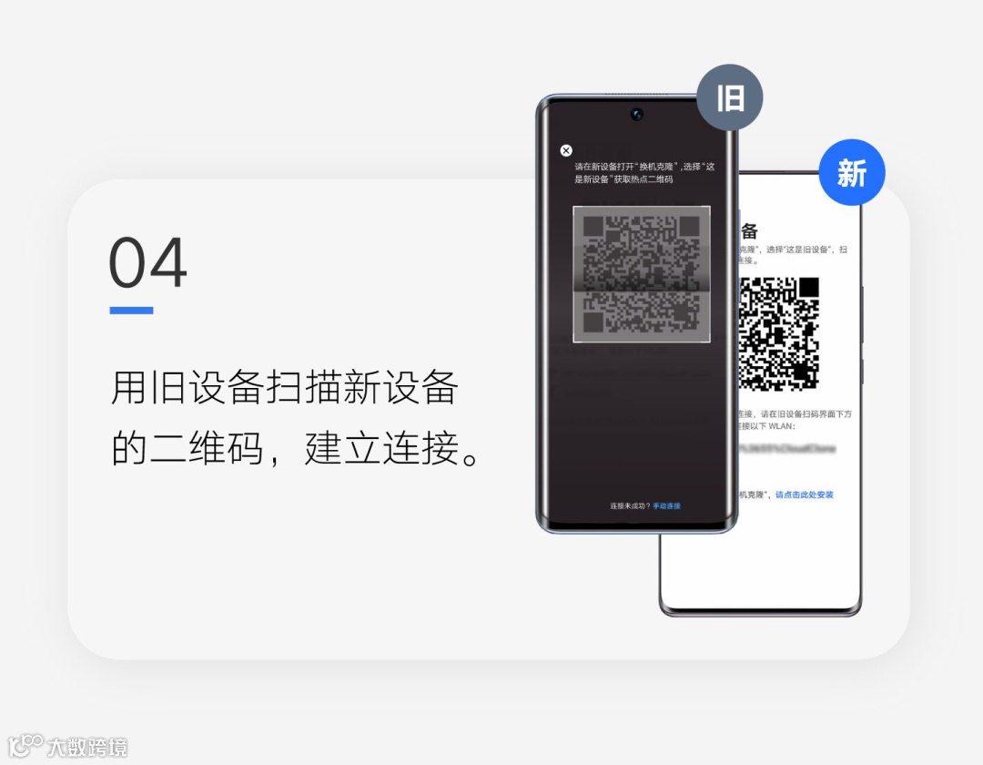 其次,我们要确定两台设备的新旧关系,不然反向克隆就麻烦了!随后,我们使用旧设备扫描新设备的二维码,建立连接,连接过程可能会有个几分钟,用户耐心等待即可。