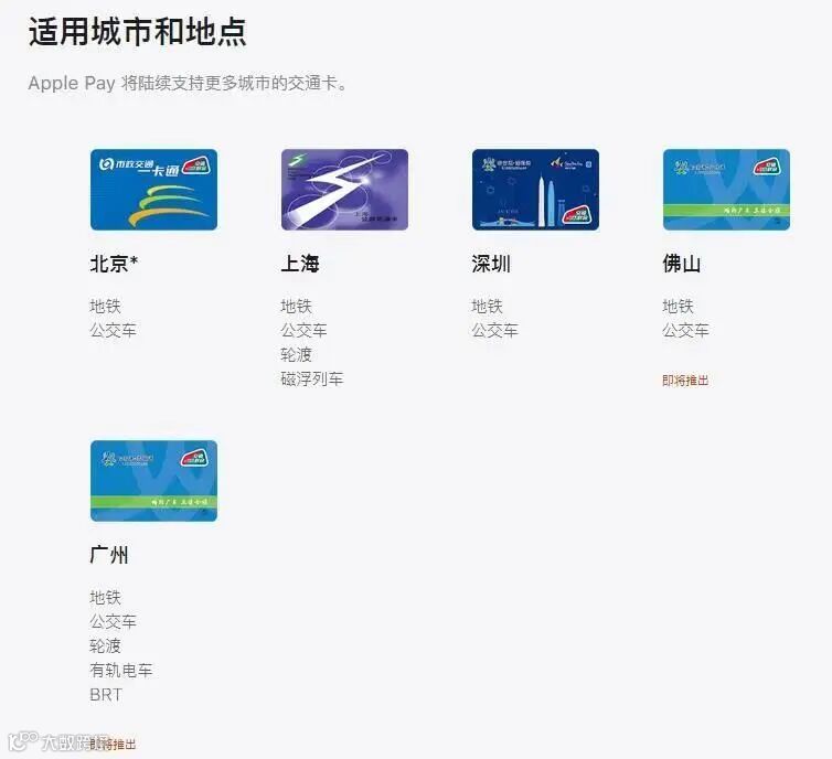 虽然苹果官网上显示的Apple Pay适用的城市和地点只有北京、上海、深圳、佛山和广州,后两者的卡片状态为“即将推出”。