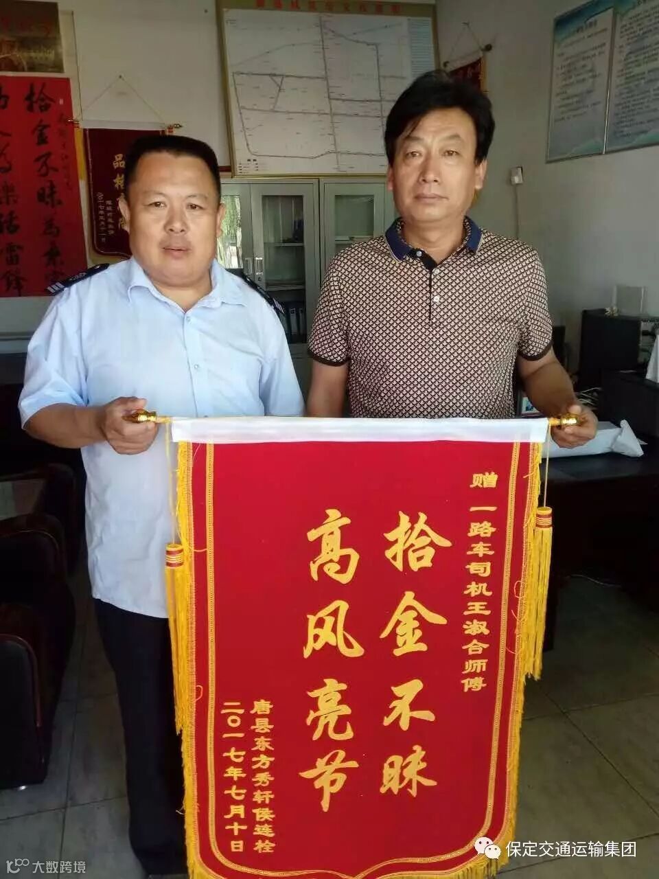 7月10上午,家住东方秀轩的侯连栓先生将一面写有“拾金不昧,高风亮节”的锦旗送到唐县公交车队,专程来感谢1路公交驾驶员王树合师傅。