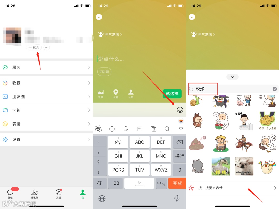 保存好背景图片后,打开 “ 微信 - 我 ” ,点击 “ + 状态 ” ,然后按照自己喜好随便选择一个状态。接着我们点击 “ 表情 ” ,选择 “ 搜索 ” 。在搜索框输入 “ 农场 ”