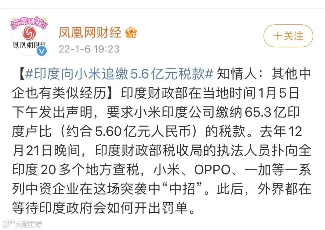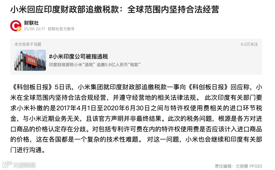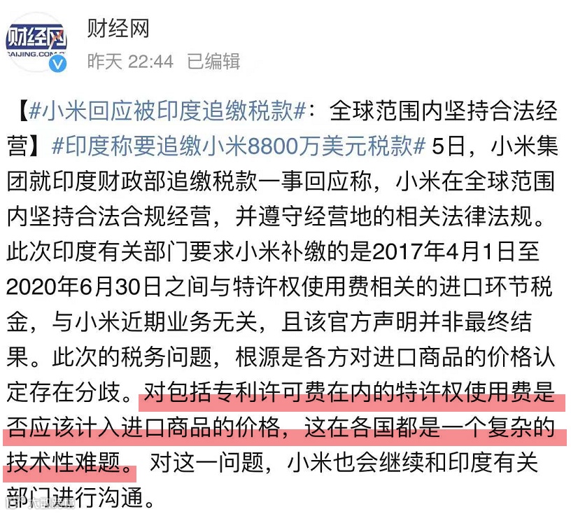 “小米在全球范围内坚持合法经营,针对此次印度有关部门要求小米补缴的是2017年4月1日至2020年6月30日之间与特许权使用费相关的进口环节税金,与小米近期业务无关,且该官方声明并非最终结果。此次的税务问题,根源是各方对进口商品的价格认定存在分歧。对包括专利许可费在内的特许权使用费是否应该计入进口商品的价格,这在各国都是一个复杂的技术性难题。对这一问题,小米也会继续和印度有关部门进行沟通。”