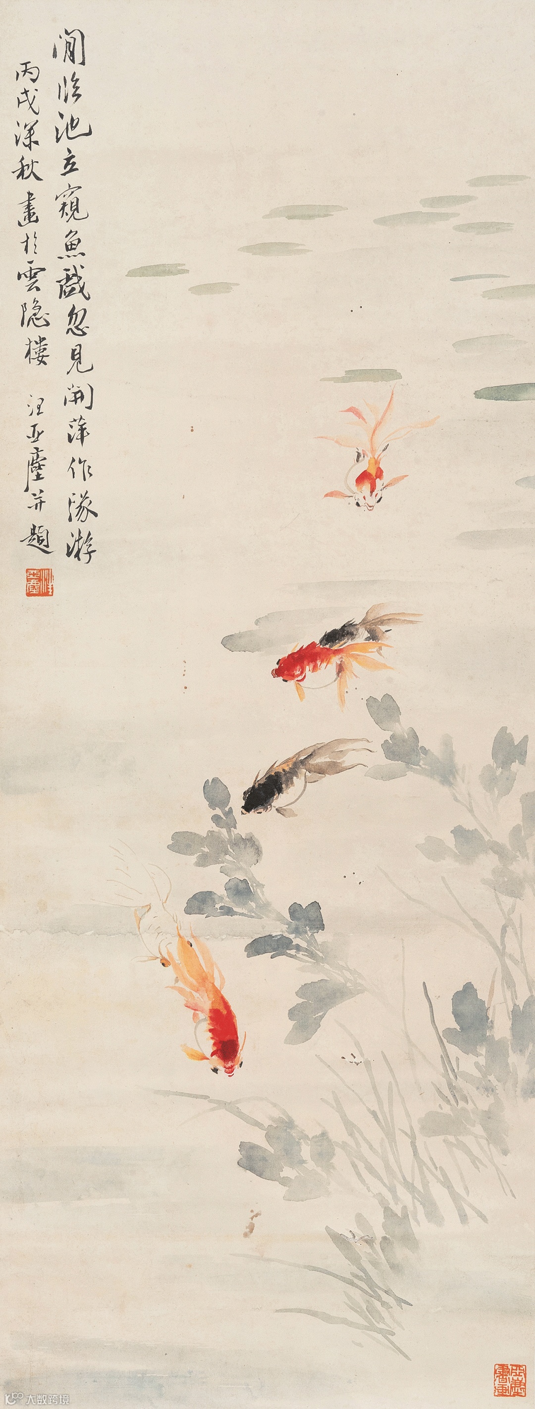 款识:闲临池立窥鱼戏,忽见开萍作队游。丙戌深秋画于云隐楼,汪亚尘并题。