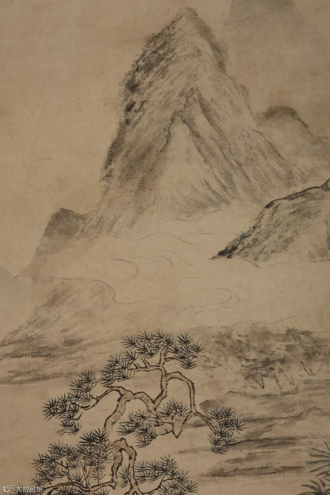 画中山石树木的描绘可见“干笔皴擦”与“湿墨点染”的结合。背景中的树石,以干笔侧锋皴出粗糙质感,再以湿墨点缀苔点,形成“毛而润”的视觉效果,既保留了笔触的书写性,又增强了物象的立体感。