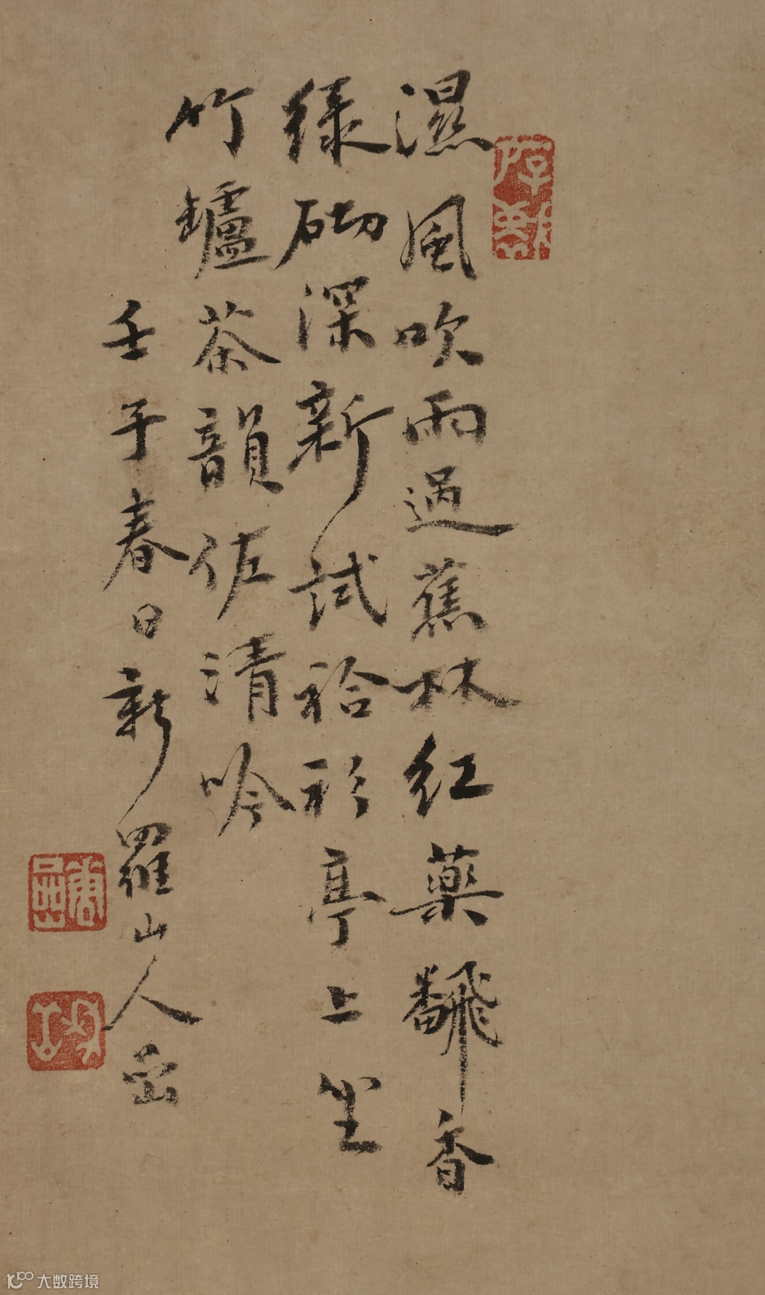 湿风吹雨过蕉林,红叶翻香绿砌深。新试袷衫亭上坐,竹垆茶韵佐清吟。壬子春日,新罗山人喦。