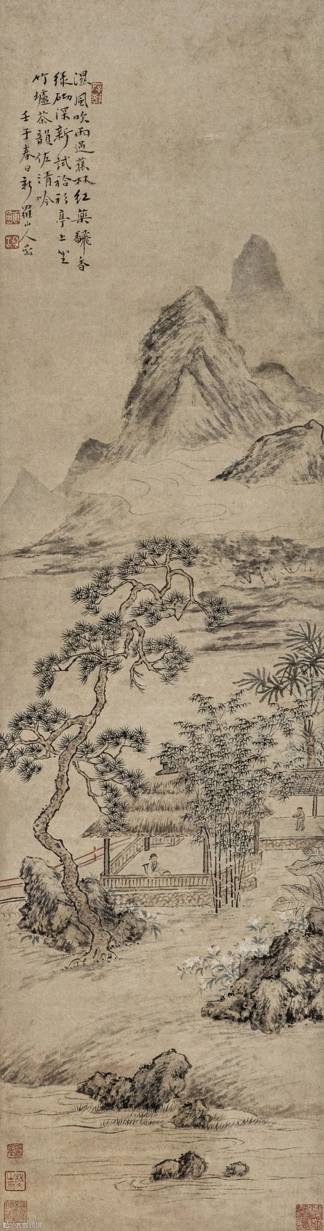 落款“壬子春日”对应华喦晚年艺术成熟,此时其画风已由早年的奇峭转为疏朗。诗中“亭上坐”的视角安排颇具禅意。全诗未见直抒胸臆之语,却在煮茶吟诗的日常场景中,透露出画家的美学理想——以清瘦高洁之形象形成诗画互文。