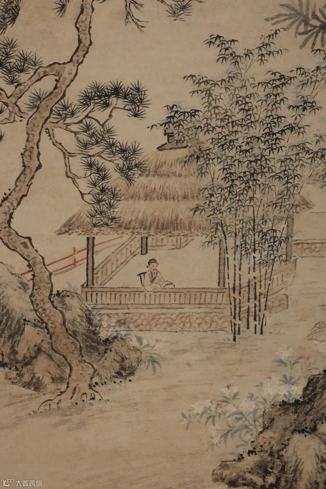 画中高士倚栏而坐亭中,远处一小童款款而来,背景以简练的丛竹、古松、时花、溪流呼应主题。人物与景物的比例关系经过精心设计,既突出“清吟”的雅趣,又不破坏整体的和谐,体现了文人画“以景抒情”的传统。