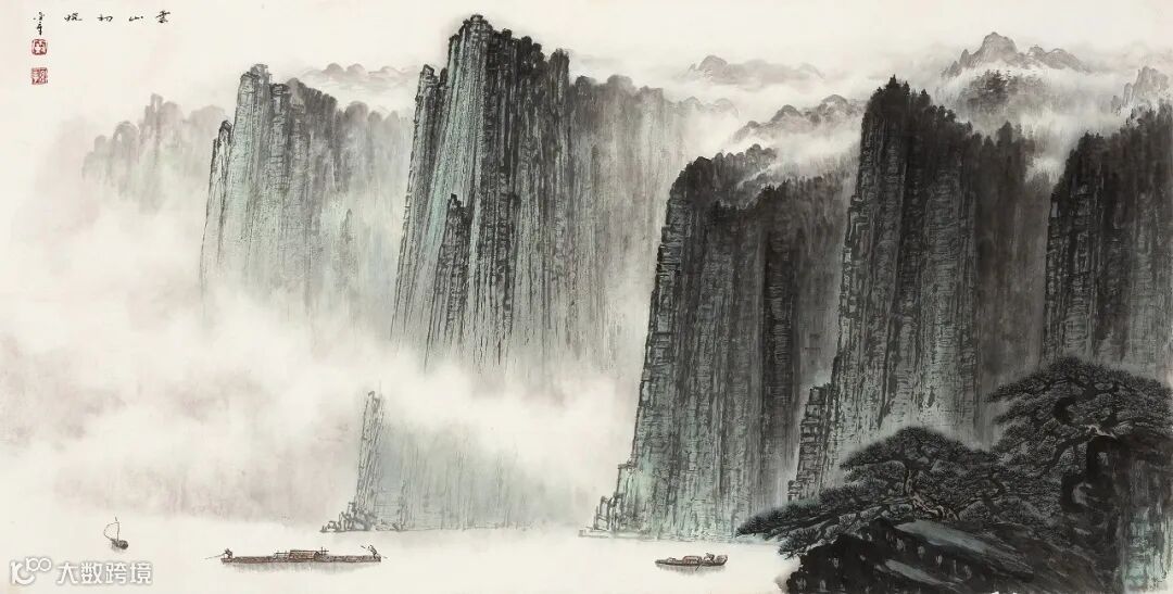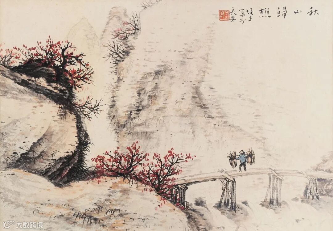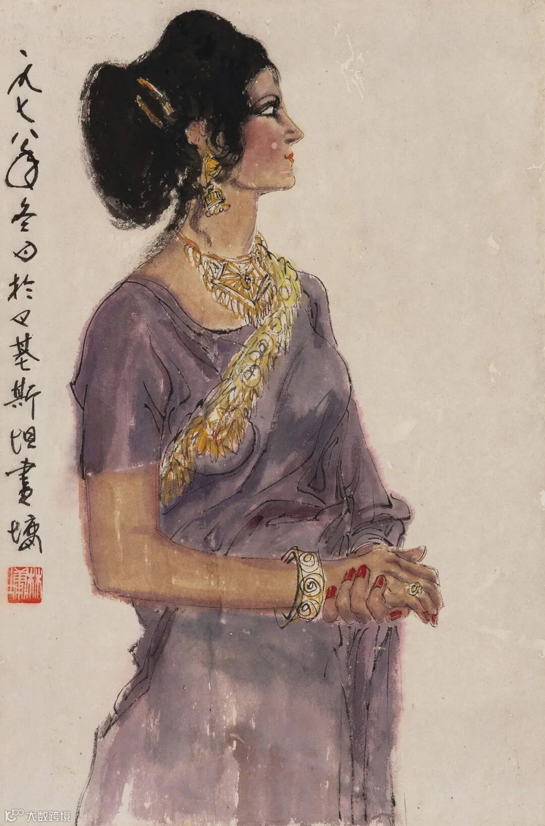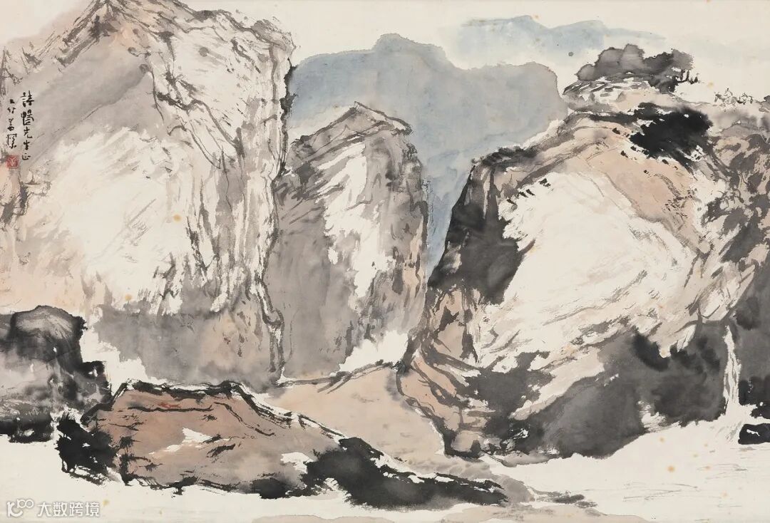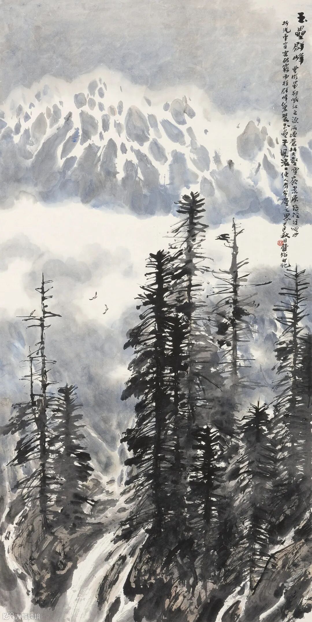 款识:曾游蜀朔岷江之源所遇,苍林大壑,雪岭荒原,路径迂回曲折,汽车穿云破雾而行,群峰黛装玉垒天风浪浪,使人有出尘之思。己巳秋日,丰俗并记。