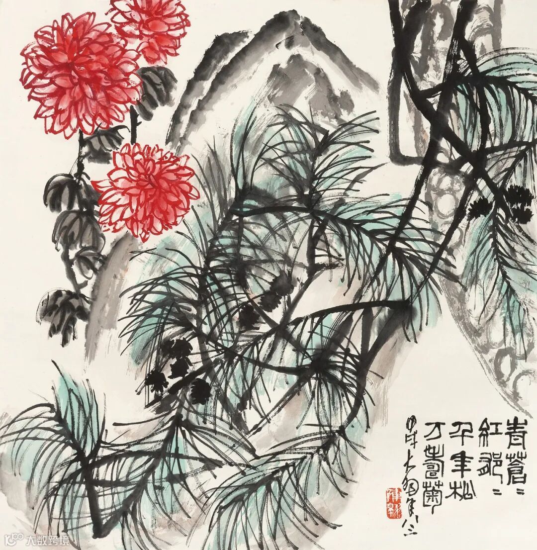 款识:青苍苍,红郁郁,千年松,万寿菊。甲戌大羽年八三。