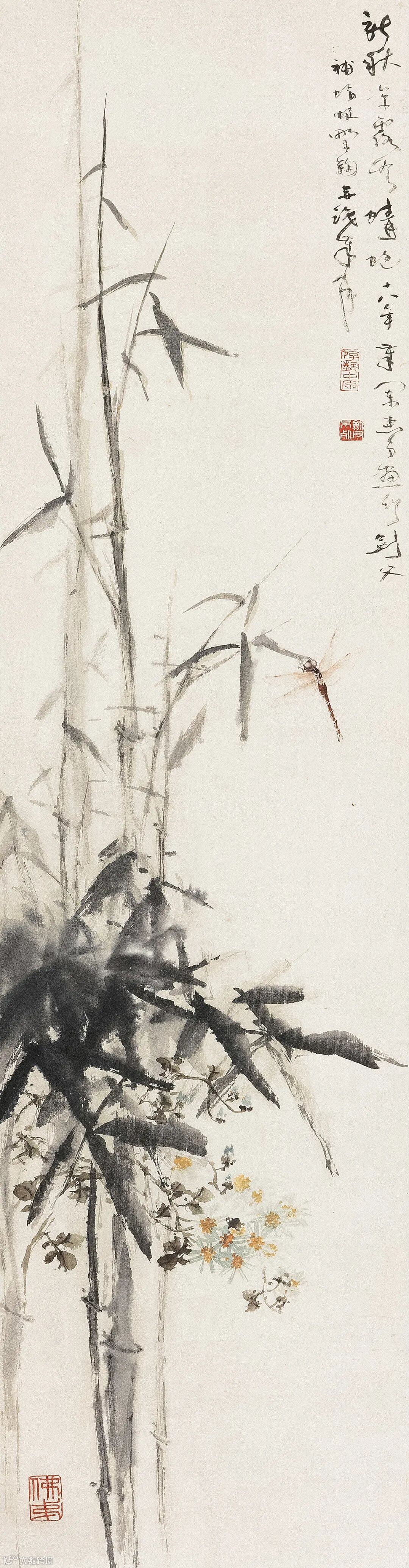款识:新秋深露有蜻蜓。十八年岁阑惠□画竹,剑父补蜻蜓野菊并识岁月。