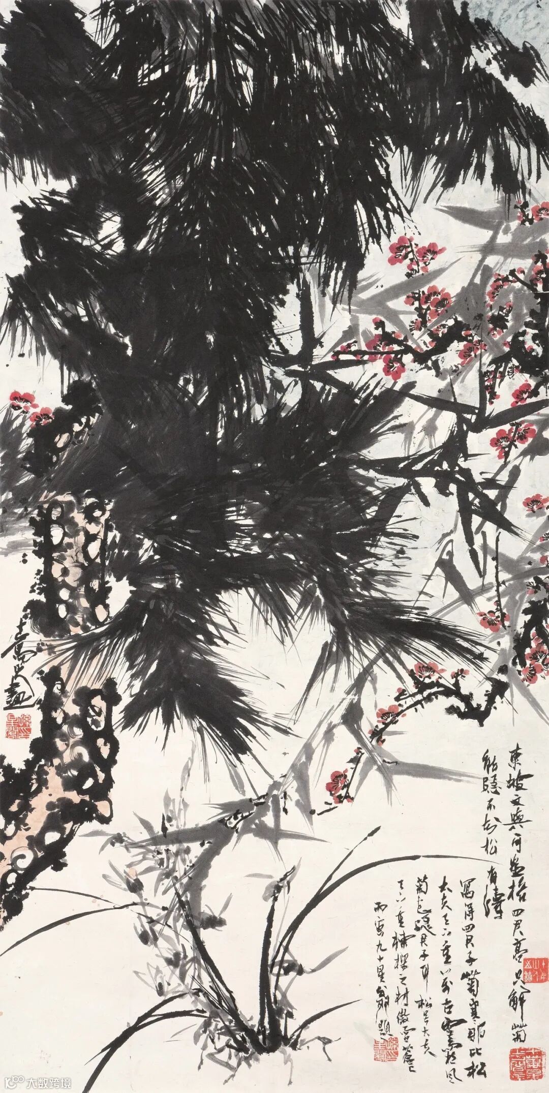 款识:1.十万山人画。2.东坡文与可画格四君高,只解菊能隐,不知松有涛。写得四君子,菊寒那比松,大夫天下重,万古雪霜风,菊花隐君子耳。松号大夫,天下重栋梁之材,傲雪苍苍。丙寅九十星翁题。