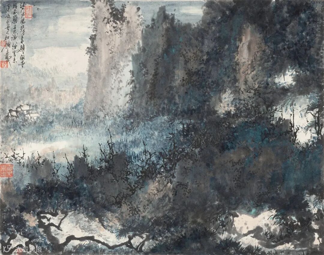 款识:焦墨渴笔之法,始于元,元人山水画为之一变,今人已少用其法。一九八八年十月雁荡归,摄鉴同志属,赖少其。