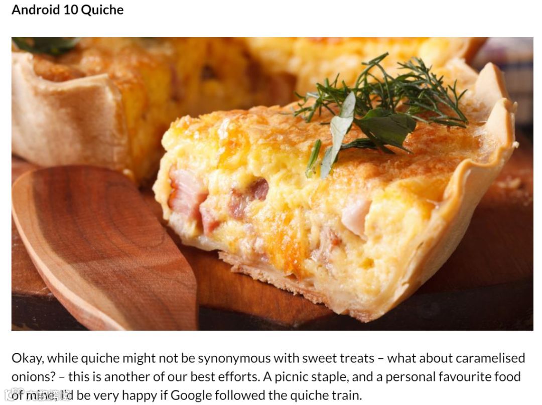 有人说是 Android 10 Quiche(乳蛋饼),还有人说是 Android 10 Quinoa(藜麦)......哎妹都看饿了。