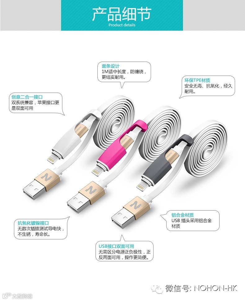 1.采用进口铜芯电缆,保证充电和数据传输速度。 2.航空铝合金材质接头,让你瞬间高富帅。 3.线材均采用进口环保TPE材质,让数据线更耐用。 4.支持3A电流过载断电保护。 |