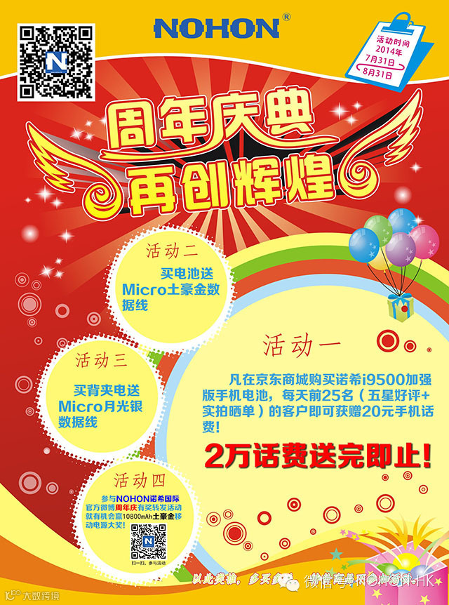 #NOHON周年庆送土豪金#即刻起至8月31日,关注@ NOHON诺希国际,转发此条微博,并@ 3位好友,即可参与抽奖。[给力]买电池送话费活动请点击: http://sale.jd.com/act/mNfiLeOgcn6.html