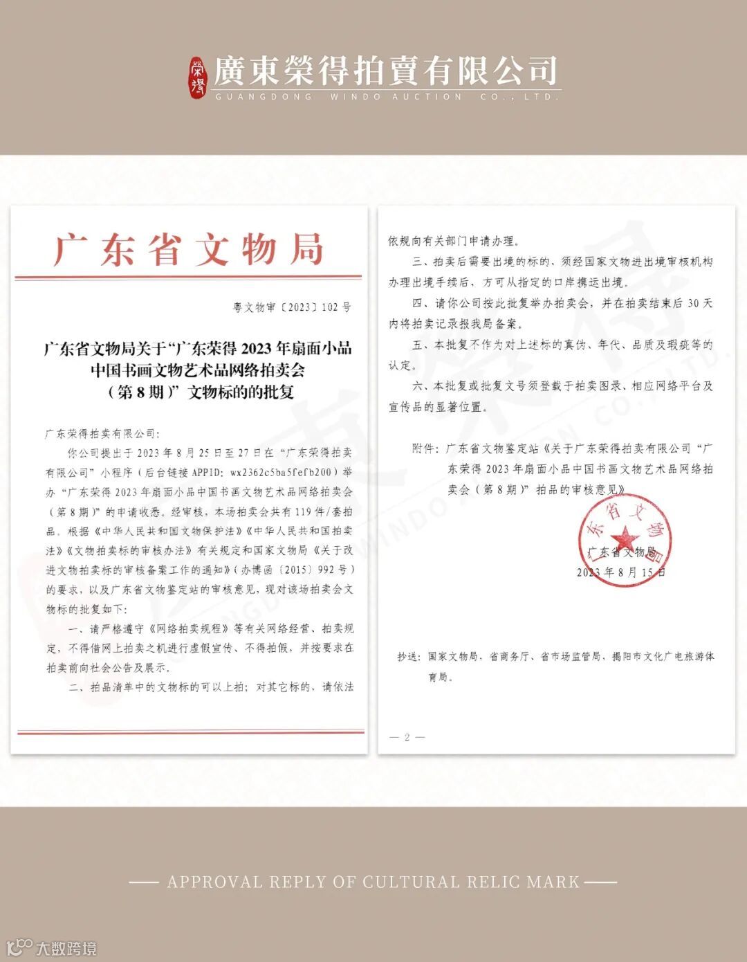 结拍时间:8月27日 早上09:30时间顺延(逐件结拍,时间间隔3分钟)