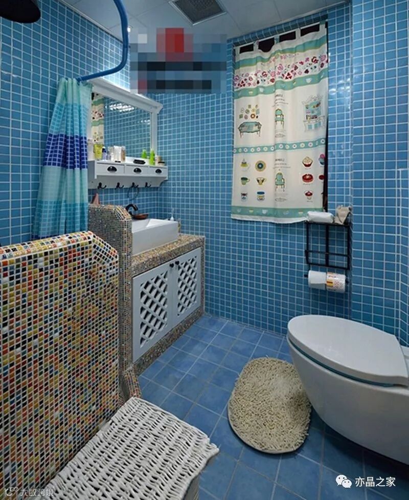 为避免空间视觉上的拥挤感,应选择清浅色系为主要背景色。瓷砖可以用冷色的风格,蓝色视觉上感觉离你更远,冷色拉开了空间!墙面最好选择白色瓷砖,尤其没有窗户的卫生间。如此以来,整个空间便不会显得那么逼仄。