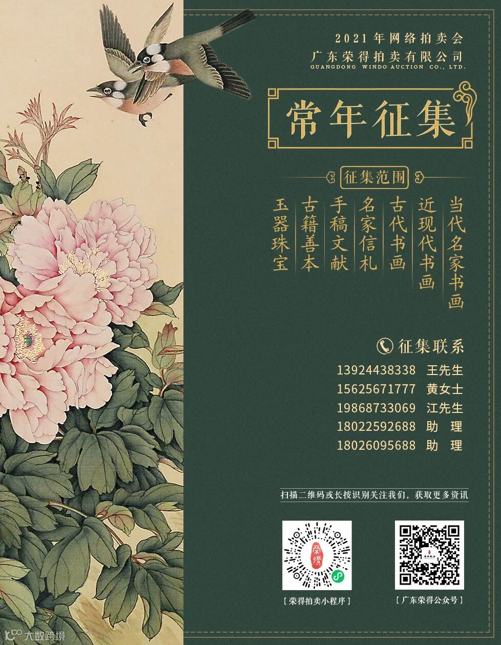 今年以来,广东荣得拍卖有限公司已成功举办了4期网络拍卖活动,其中3期「中国书画精品专场」拍卖活动和1期「中国玉都 · 揭阳阳美玉器专场」的首拍活动,承蒙各位藏家和艺术爱好者的鼎力支持,拍卖会均取得了喜人的成绩。