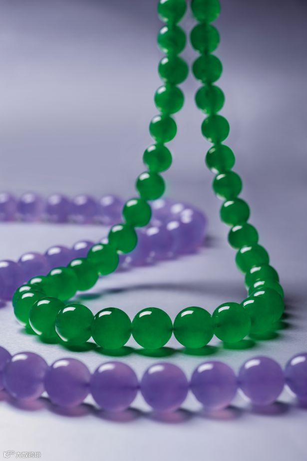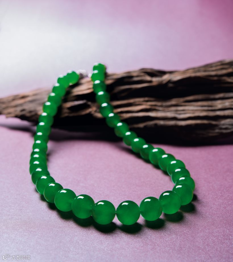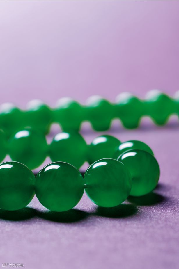 翡翠珠鏈,是翡翠首飾中之極品,它講求無綹無裂,內含物少,色澤統一,深淺一致,大小均稱,渾圓天成。一串種水俱佳的極品可以在拍賣會中屢創高價,一直都是拍賣場上壓軸的重頭戲,更何況是兩串成色絕佳的稀世臻品 —— 「紫氣東來」和「玉翠仙蹤」。
