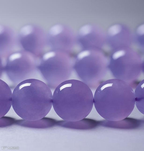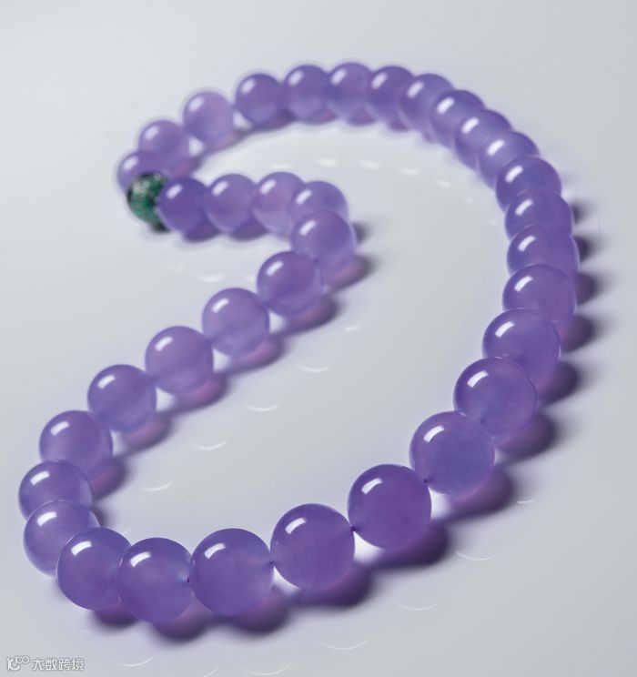 通常對於紫羅蘭翡翠,色彩與種水很難兼得,常見紫羅蘭翡翠色澤較淺,成片分佈,白綠紫三色相間,界線模糊。然而細品此珠鏈其質,翡翠內互相緊扣的微小晶體,顆粒幼細、結構致密、通透性極高,且每一顆翡翠珠尺寸在肉眼之下幾乎毫無分別,明媚清澈,光澤瑩爍。