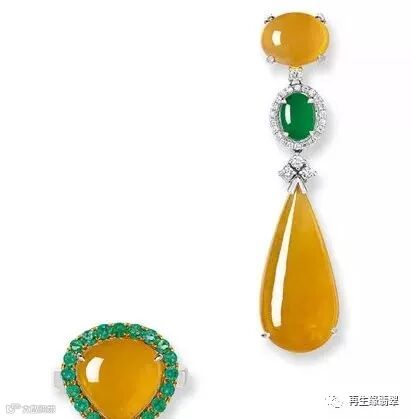 天然黄翡翠配祖母绿戒指;及吊坠套装
