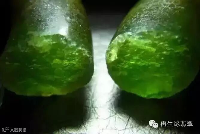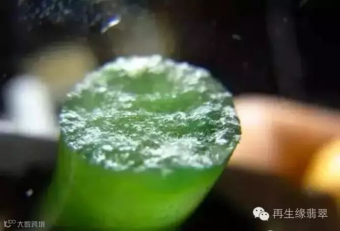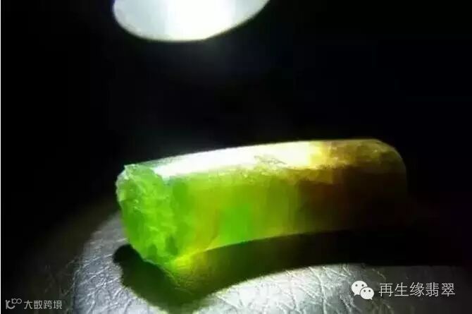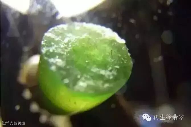 下面这张照片,稍微给了一点外来光,可以看见表面细润,断口冰种的翡翠本质,而尾部黑的部分,是天然气残留在表面的黑烟。