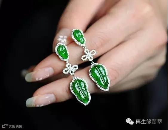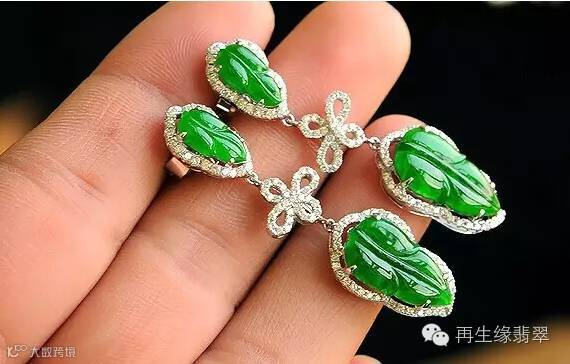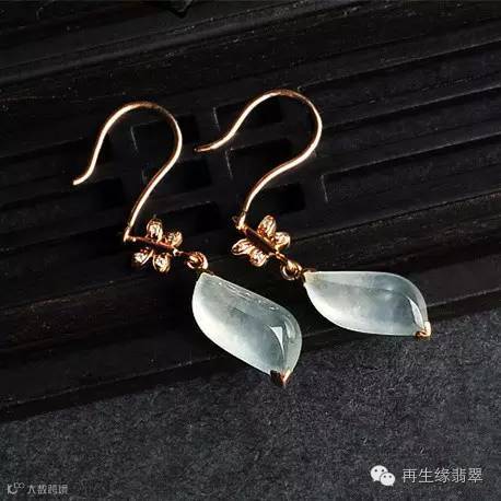 在垂耳式翡翠耳环中还有一种树叶形耳环。翡翠雕成叶片状,以金属链相连,佩戴时翡翠叶片下垂。树叶形耳环的叶子形状大同小异。