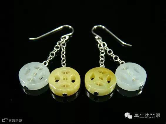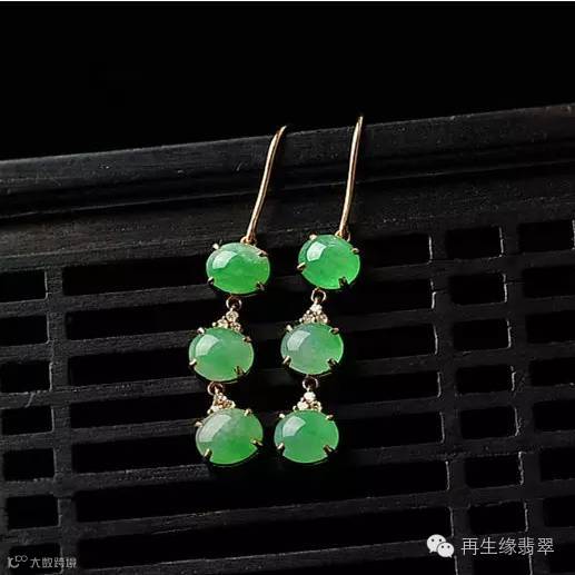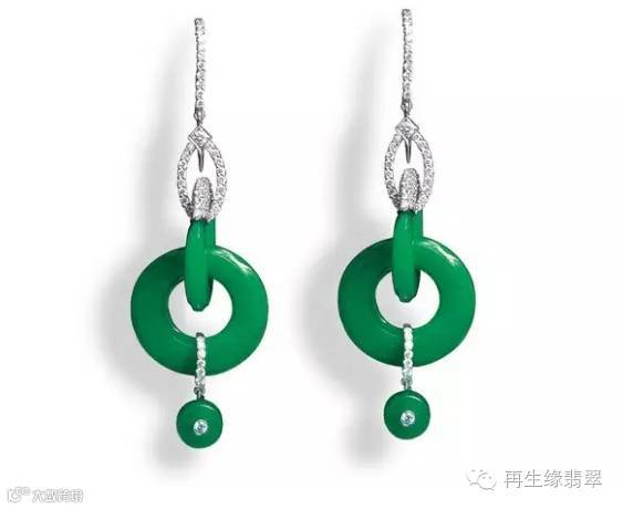 另一种是翡翠小圆耳环与一条金链相连,佩戴时翡翠小圆耳环会自由摇荡,叫“荡环式”,在金链的另一端与耳朵连处还可以衬托一些小钻石或金珠,以增添耳环的名贵。