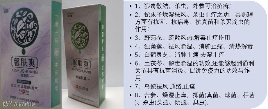 [主要成分]狼毒、黄柏、独角莲、白鹤灵芝、土茯苓、苦参、蛇床子、乌蛇等中草药萃取的草本植物精华及醋酸氯洗必泰、冰片、薄荷脑、白凡士林、硬脂酸、蒸馏单硬脂酸甘油酯等。