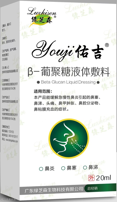 佑吉β-葡聚糖液体敷料具有清除游离基、抗辐射、溶解胆固醇,抵抗过滤性病毒、真菌、细菌等引起的感染等作用。其医药功效可缓解瘙痒、疼痛、灼烧或针刺感、糜烂溃疡、水疱、红斑症状;缓解急慢性鼻炎引起的鼻塞、鼻涕、头痛、鼻甲肿胀、鼻腔分泌物、鼻黏膜充血等症状。