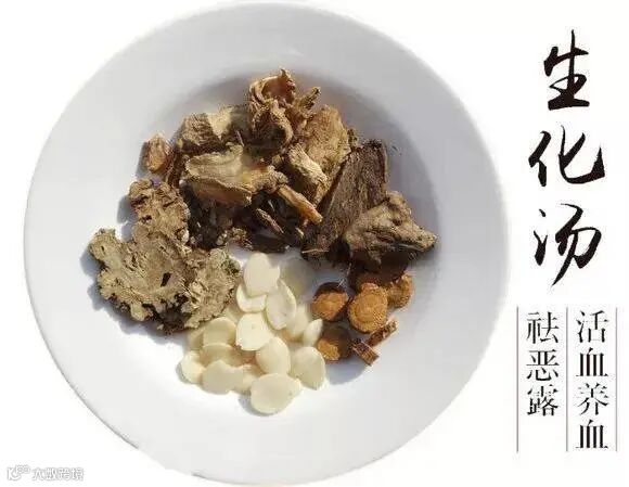 方中当归味辛甘而性温,一药三用:一取其补血之功,以补产后血虚之不足;二取活血之用,以化瘀生新,寓生新于补血之中,生新不致留瘀,化瘀而不伤血;三取温经散寒之效,以治小腹冷痛。故最适合产后虚、寒、瘀之病机,故重用为君药。川芎活血行气止痛;桃仁活血祛瘀,共为臣药,助君药活血祛瘀,以治恶露不行。因产后血虚夹寒,故配炮姜入血分,温经散寒以止痛;黄酒温经行血,助药力通血脉;二者配伍重在温经散寒止痛,以治小腹冷痛,共为佐药。炙甘草调和诸药,为使药。诸药合用,养血与活血并用,有化瘀生新之功,故有“生化”之名。